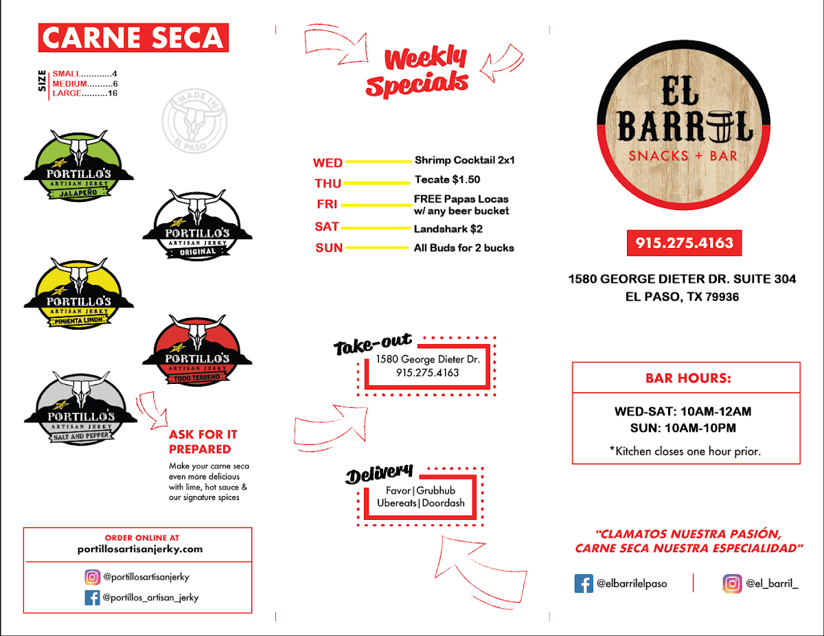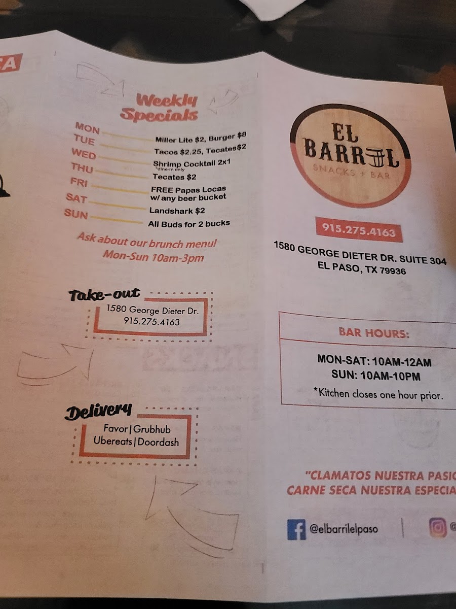 Welcome to El Barril, a hidden gem in El Paso, TX, where authentic Mexican flavors come alive. This charming spot focuses on a delightful taco menu that features mouthwatering options like Carne Asada and Tripitas, each served with fresh toppings including diced onions and cilantro, complemented by in-house salsas.